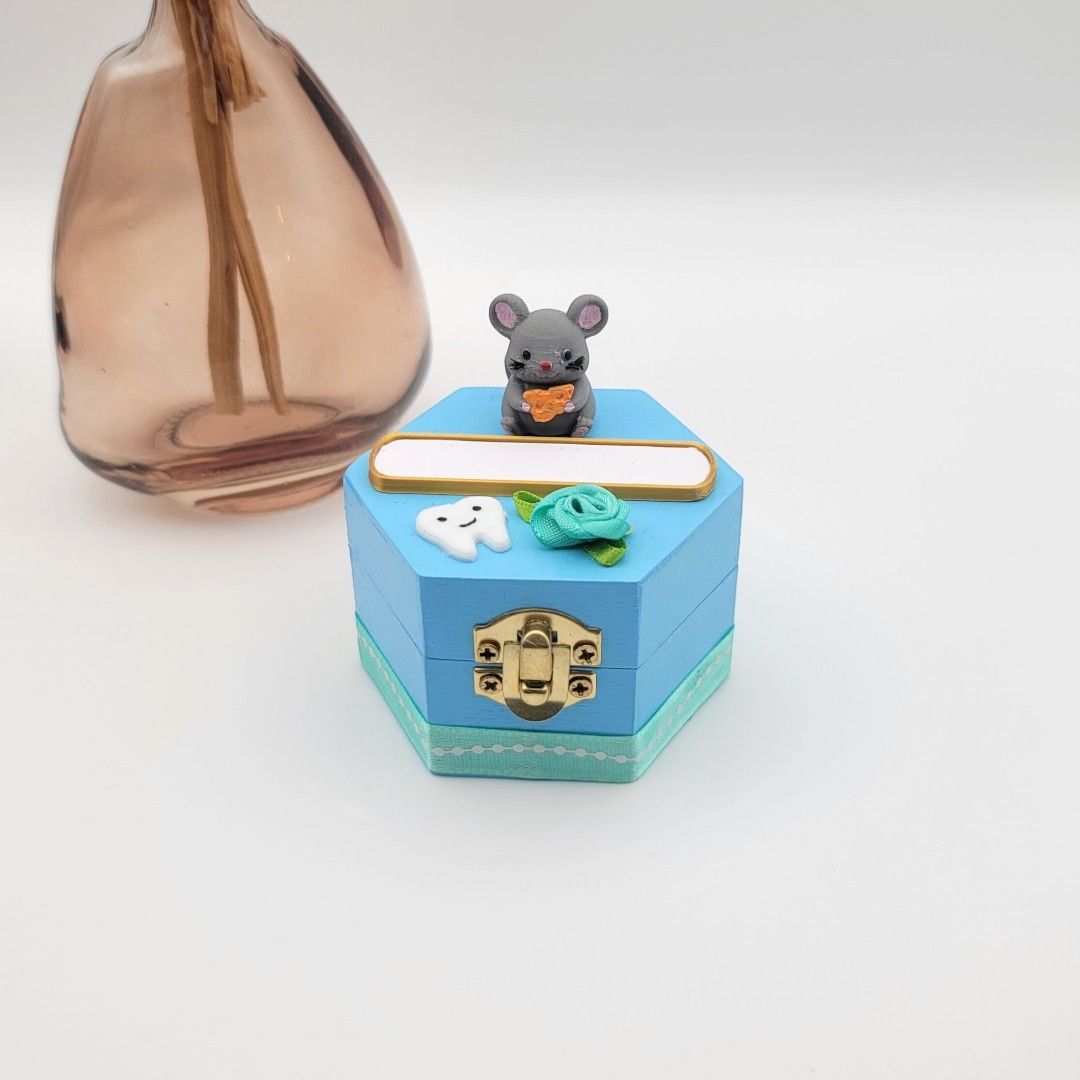 Boîte à dents de lait bleue hexagonale en bois - Souris