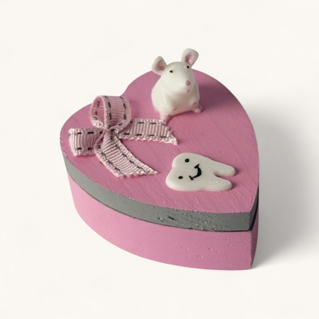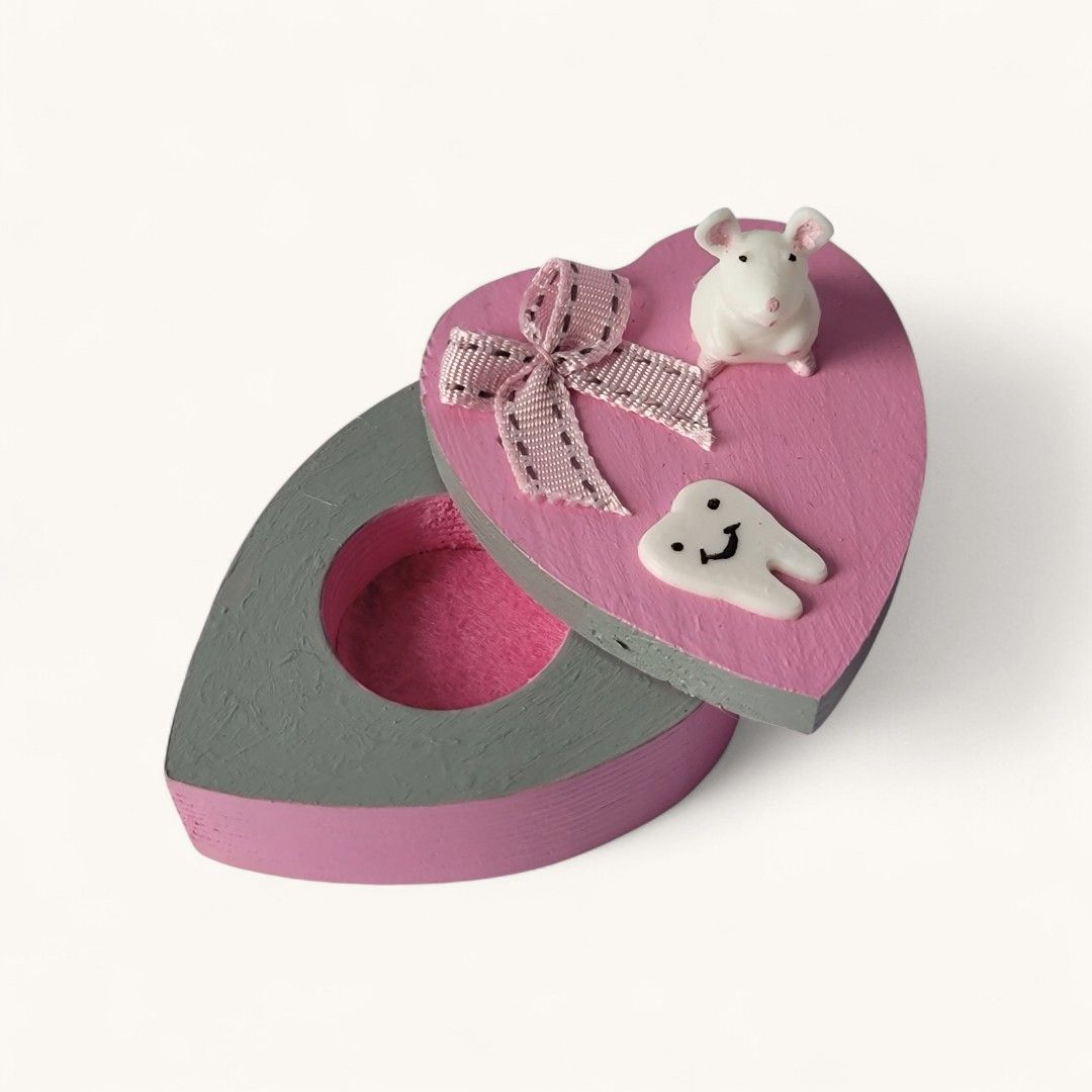 Découvrez ma petite boîte à dents en forme de cœur, peinte à la main ! 🌟 Avec une adorable souris et une petite dent en 3D, elle est parfaite pour conserver les souvenirs des premières dents de votre enfant. Un cadeau unique qui fera fondre les cœurs !