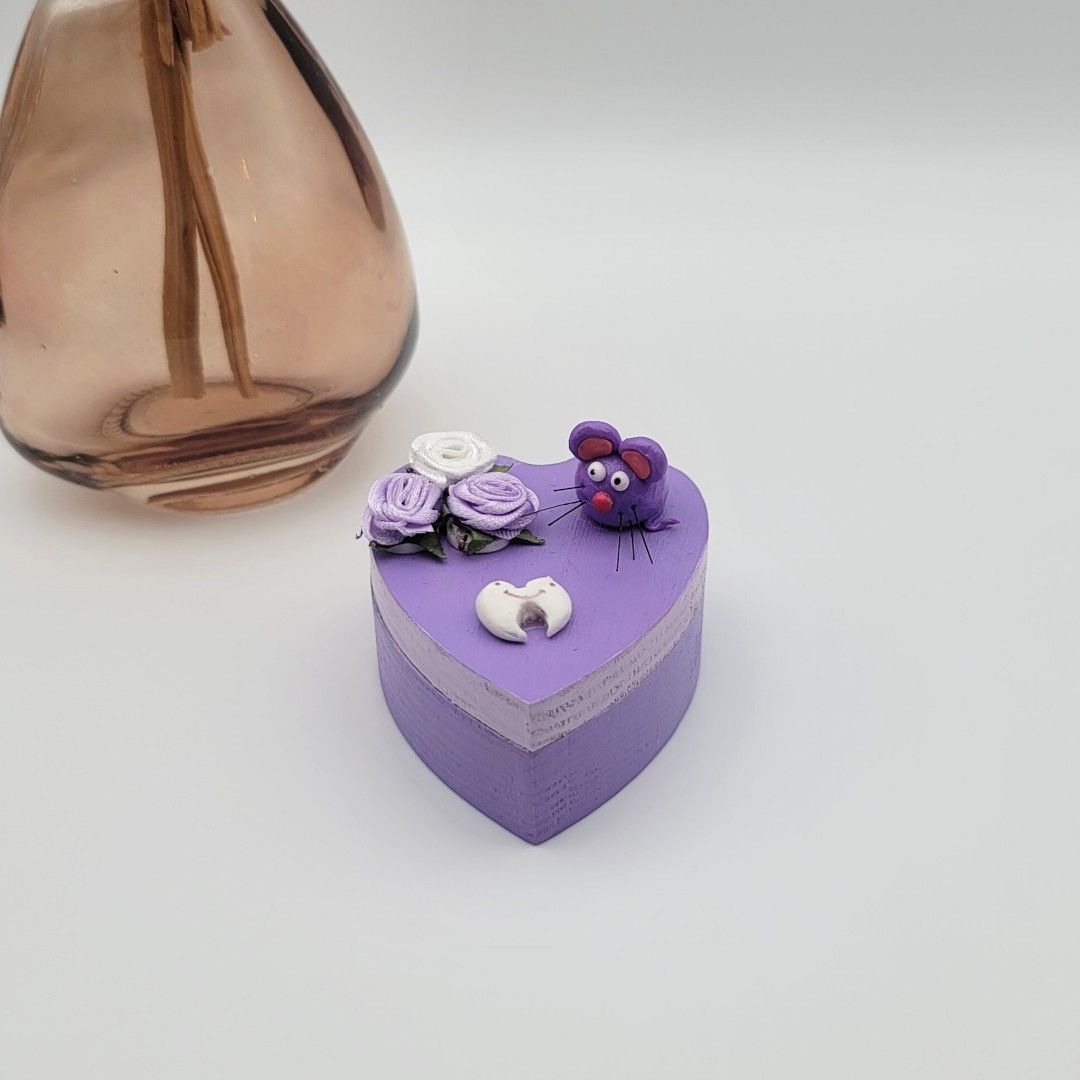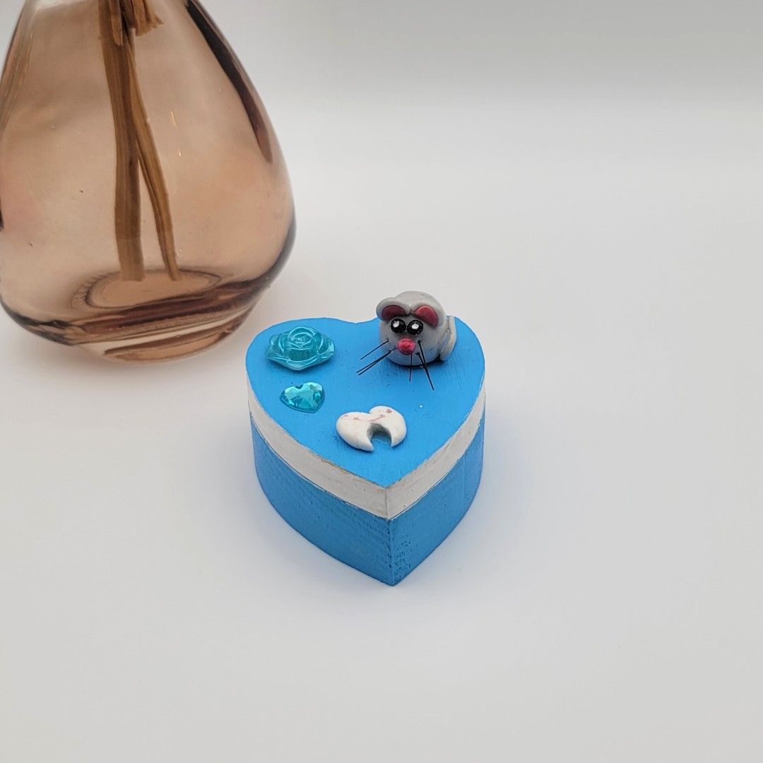 Découvrez ma petite boîte à dents en forme de cœur, peinte à la main ! 🌟 Avec une adorable souris et une petite dent en 3D, elle est parfaite pour conserver les souvenirs des premières dents de votre enfant. Un cadeau unique qui fera fondre les cœurs !