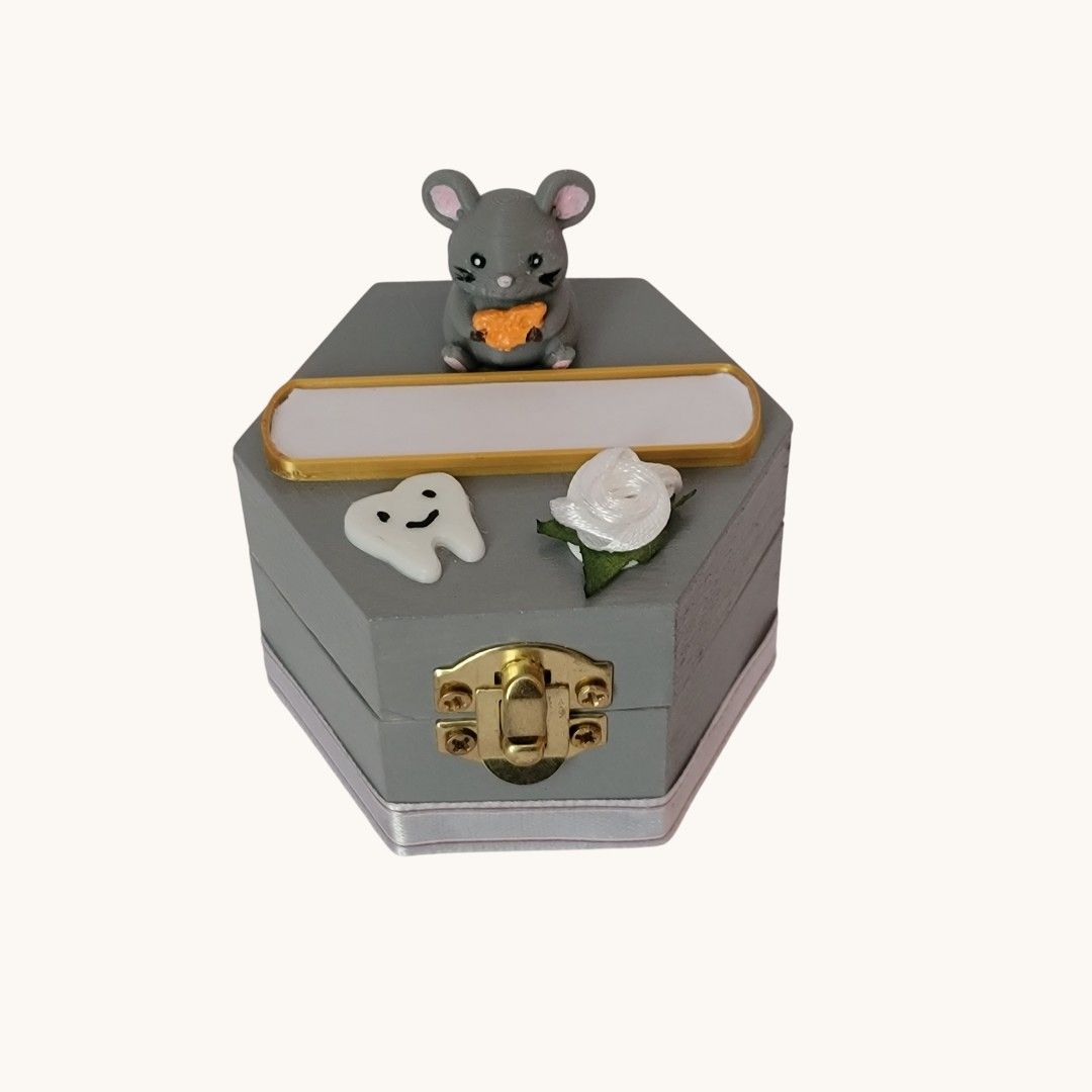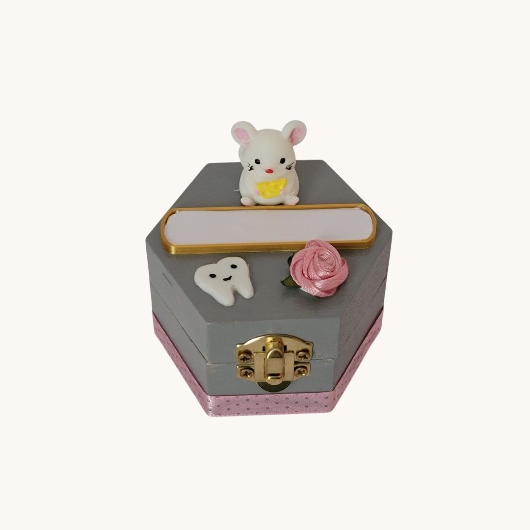 Découvrez ma petite boîte à dents hexagonale, peinte à la main ! 🌟 Avec une adorable souris et une petite dent en 3D, elle est parfaite pour conserver les souvenirs des premières dents de votre enfant. Un cadeau unique qui fera fondre les cœurs !