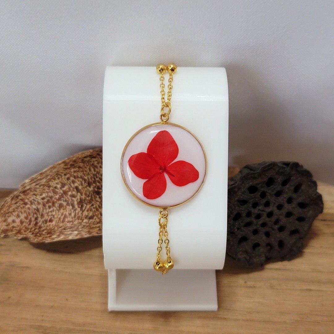 Bracelet cabochon en résine avec fleurs séchées, monté sur chaîne en acier inoxydable. Élégant, léger et durable, il apporte une touche naturelle et moderne à votre poignet. Hypoallergénique et conçu pour durer.