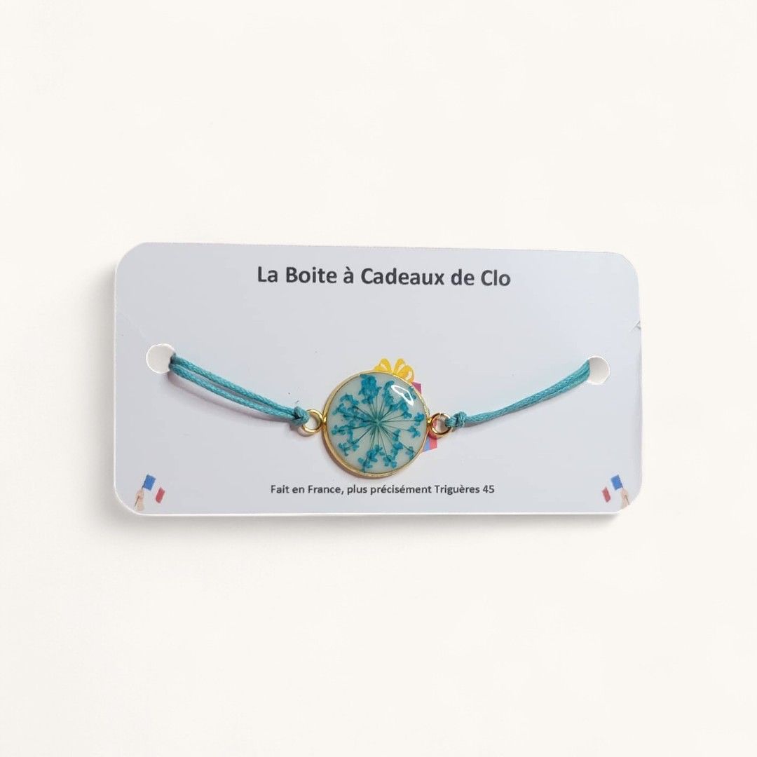Bracelet en résine avec un cordon, des attaches dorées et avec un cabochon en résine avec des fleurs naturelles séchées à plat.