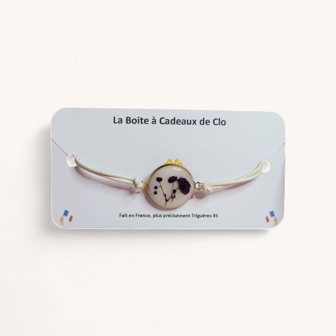 Bracelet en résine avec un cordon, des attaches dorées et avec un cabochon en résine avec des fleurs naturelles séchées à plat.