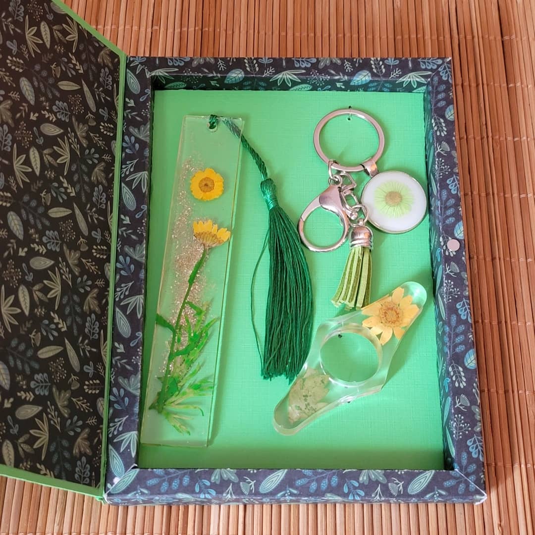 Coffret du lecteur à personnaliser soi-même, avec marque page, bague de lecture et porte-clés assortis. Tout ça dans un joli coffret fait en scrapbooking.