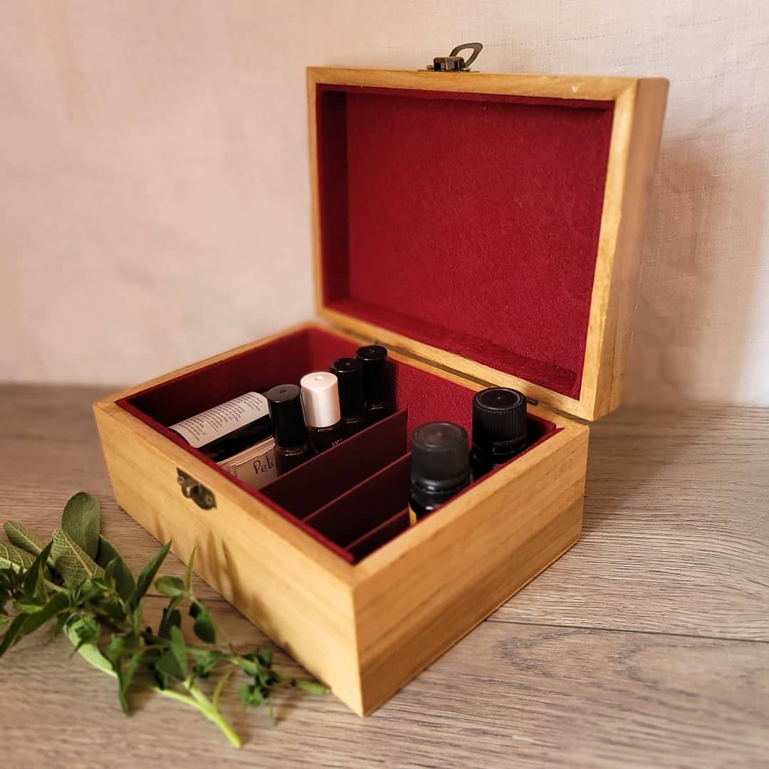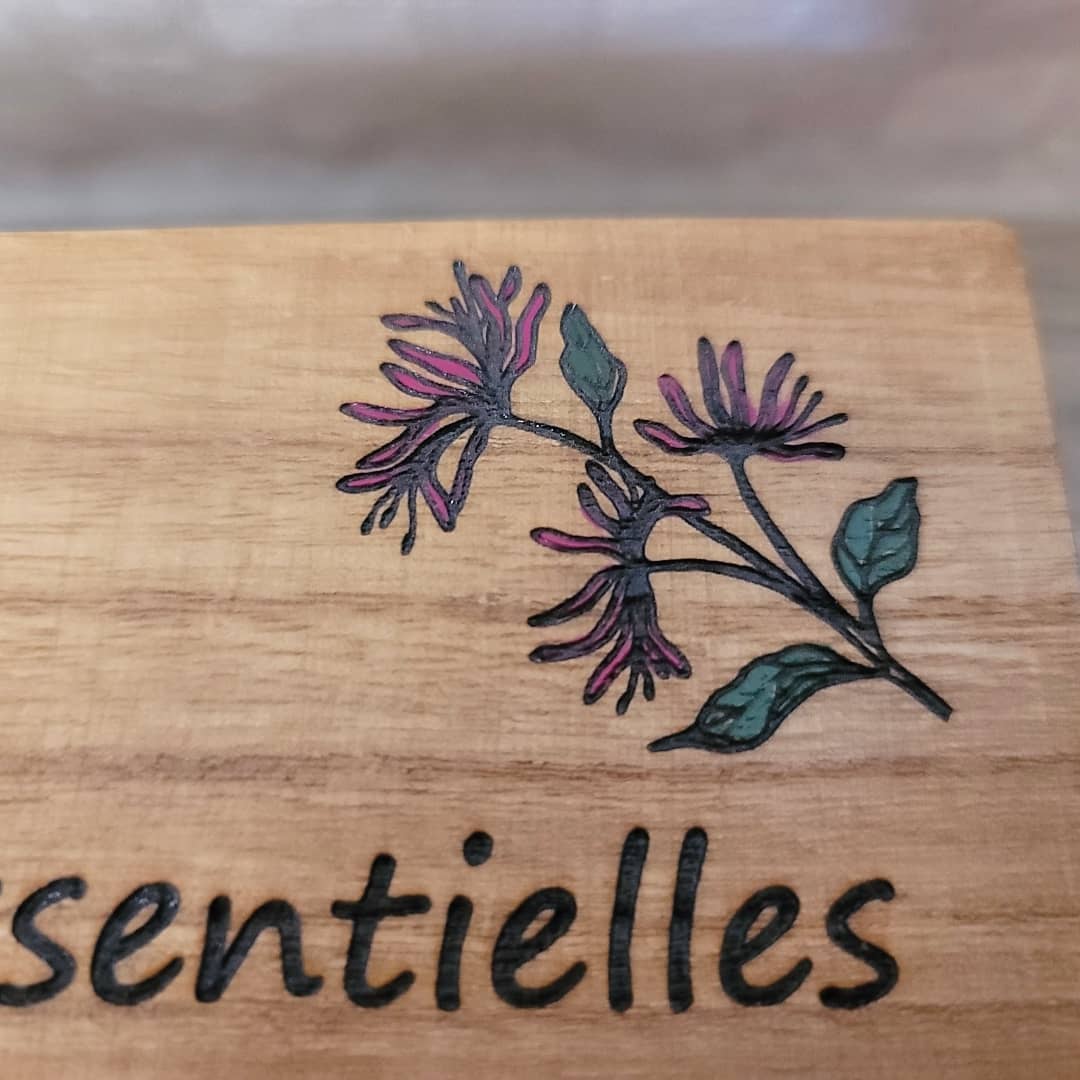 Coffre en bois, dessin pyrogravé laser et peint à la main. L'intérieur est recouvert de feutrine. Idéal pour ranger ses flacons d'huiles essentielles.