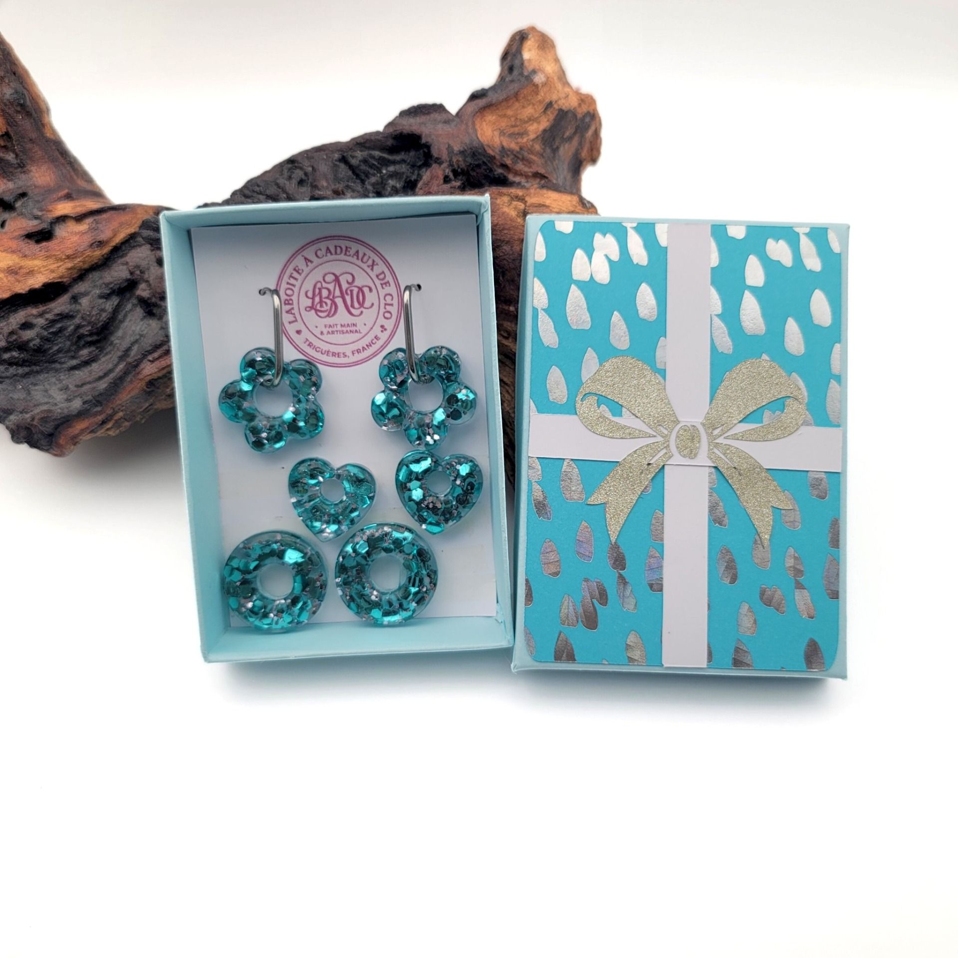 Sublimez votre regard avec le Coffret Éclat ! 🌟 Un écrin de scrapbooking unique renfermant 3 paires de pampilles en résine pailletée et une paire de créoles élégantes. Le cadeau artisanal parfait pour briller en toute occasion. Fait main avec amour ! ❤️