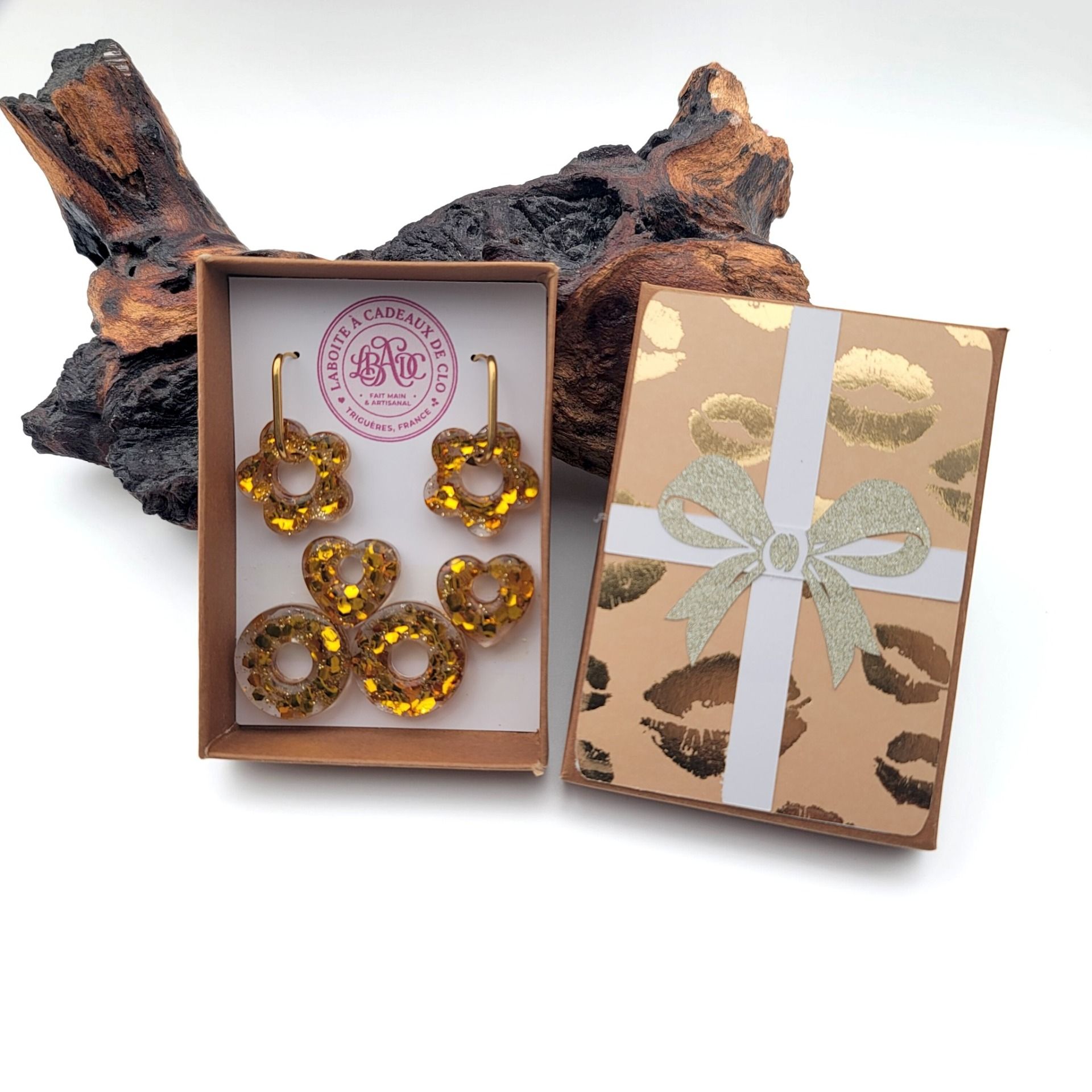 Sublimez votre regard avec le Coffret Éclat ! 🌟 Un écrin de scrapbooking unique renfermant 3 paires de pampilles en résine pailletée et une paire de créoles élégantes. Le cadeau artisanal parfait pour briller en toute occasion. Fait main avec amour ! ❤️