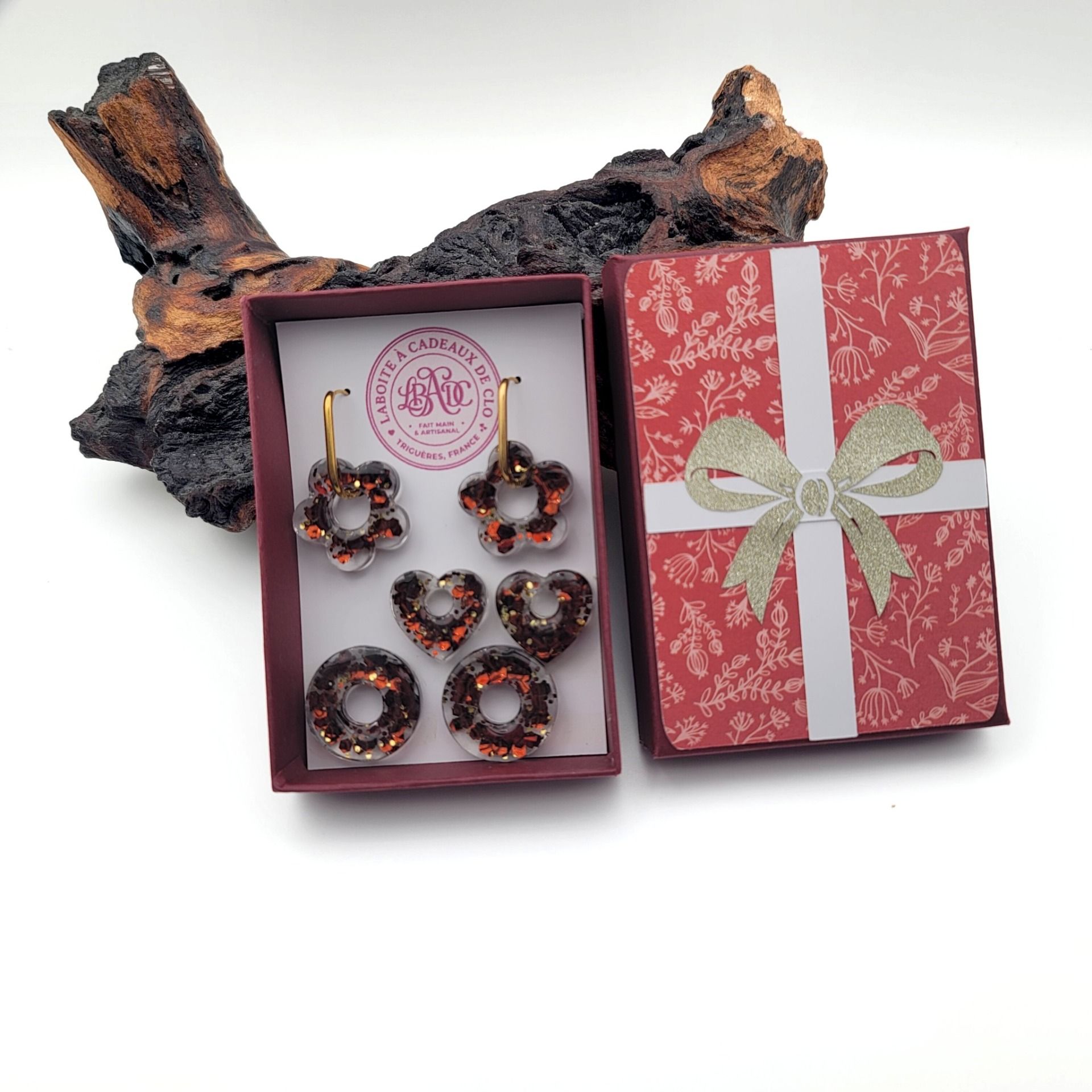Sublimez votre regard avec le Coffret Éclat ! 🌟 Un écrin de scrapbooking unique renfermant 3 paires de pampilles en résine pailletée et une paire de créoles élégantes. Le cadeau artisanal parfait pour briller en toute occasion. Fait main avec amour ! ❤️