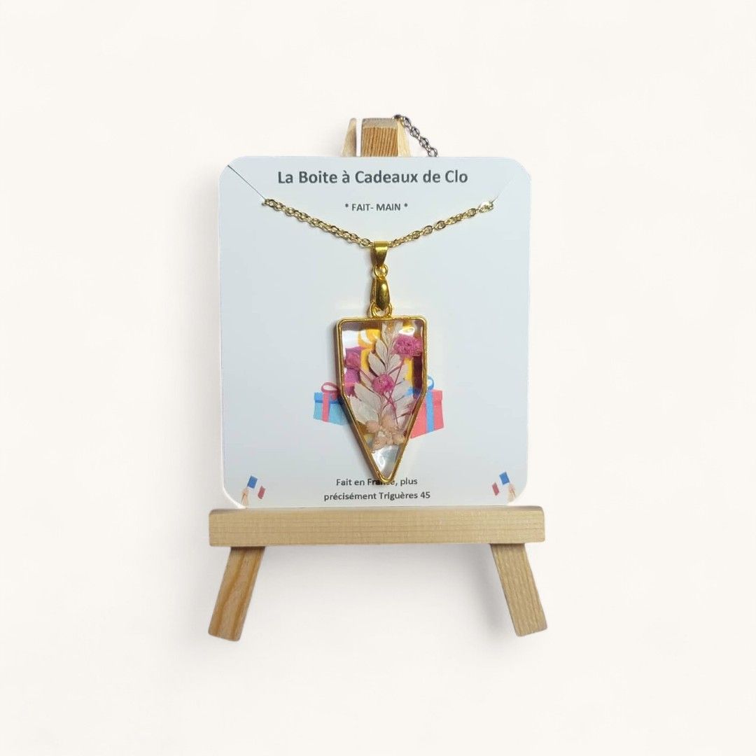 Médaillon fantaisie en résine UV, avec en inclusion des fleurs sur ton rose et blanc, est accompagné d'une chaine en acier inoxydable dorée.