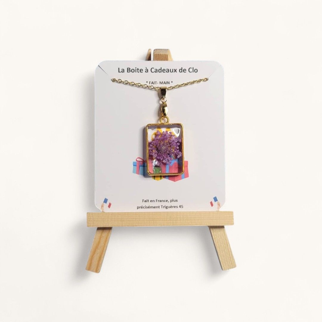 Médaillon fantaisie rectangle en résine, avec en inclusion une fleur ton mauve, est accompagné d'une chaine en acier inoxydable dorée.