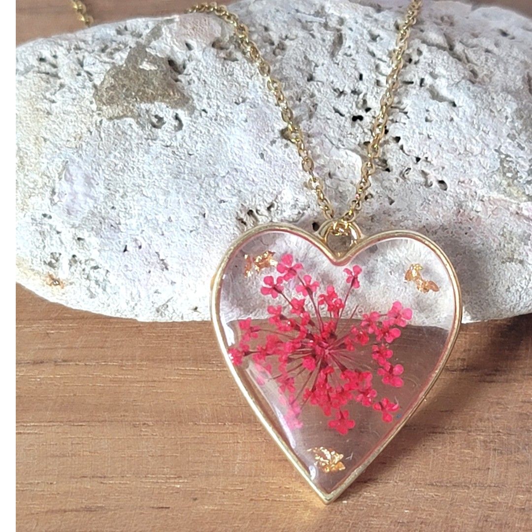 Médaillon résine coeur fleurs séchées rouge