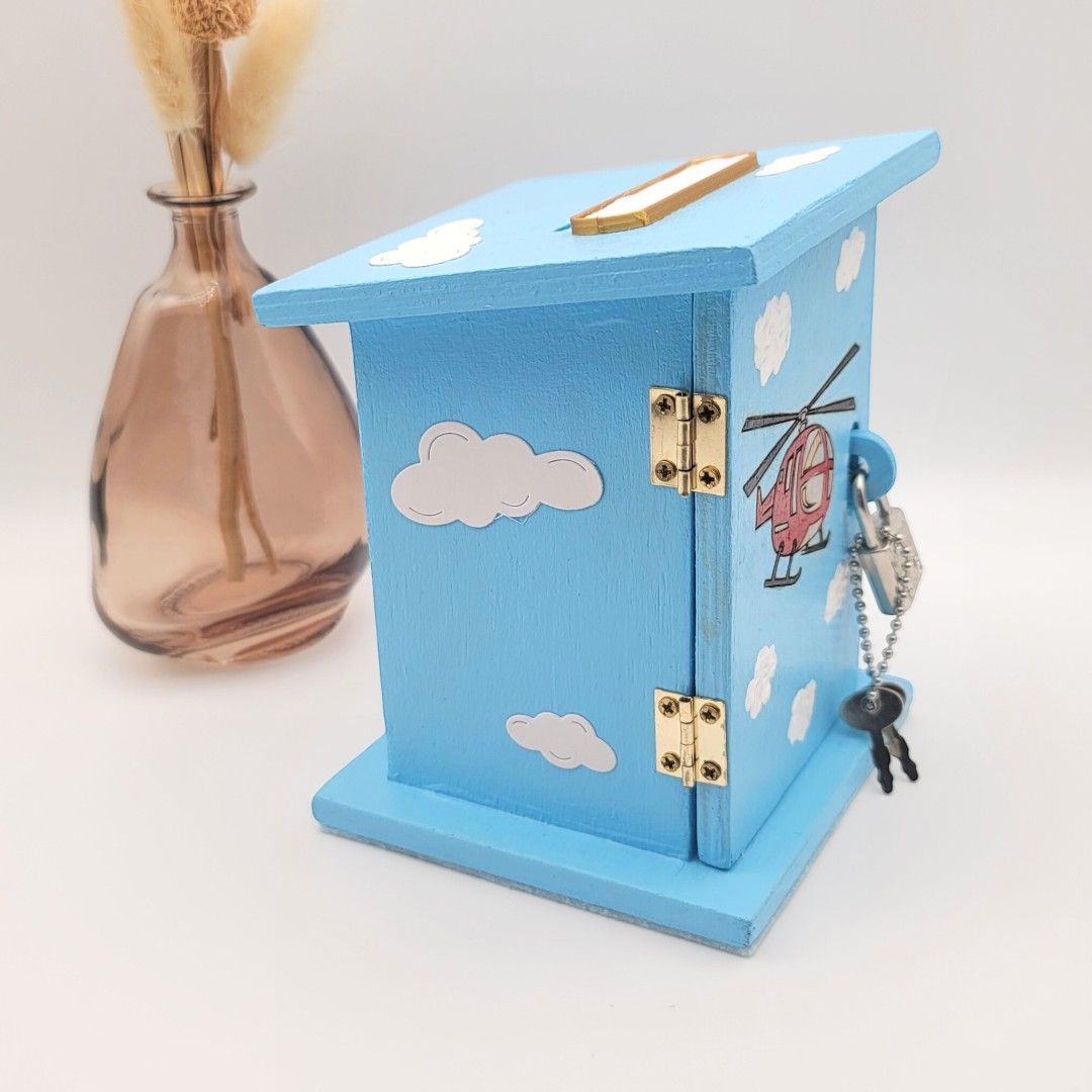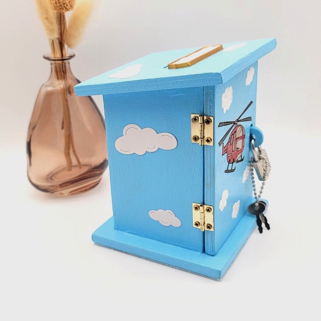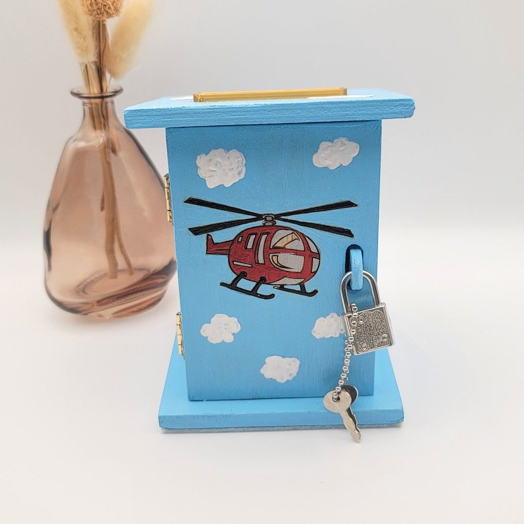 Prenez de la hauteur avec cette tirelire unique en bois ! Décorée d'un hélicoptère gravé au laser et peint à la main, elle est l'écrin parfait et sécurisé par cadenas pour les premières économies de votre enfant.