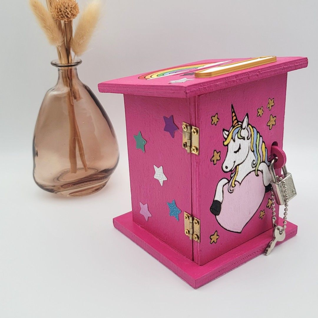Tirelire en Bois Licorne Féerique – Gravure Laser & Peinte à la Main
