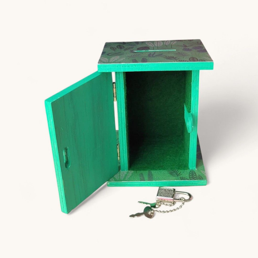 Tirelire pour enfant en bois naturel peinte avec une étiquette de personnalisation. Le décor est entièrement fait à la main en scrapbooking. Le fond est recouvert de feutrine.