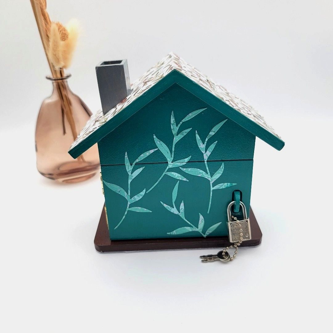 Craquez pour cette adorable tirelire maison "Panda" ! Faite main en scrapbooking, elle apporte zen et magie à la chambre de votre enfant. Un cadeau artisanal unique avec cadenas et clés, disponible sur La Boîte à Cadeaux de Clo. 🐼🌿 Un vrai coup de cœur