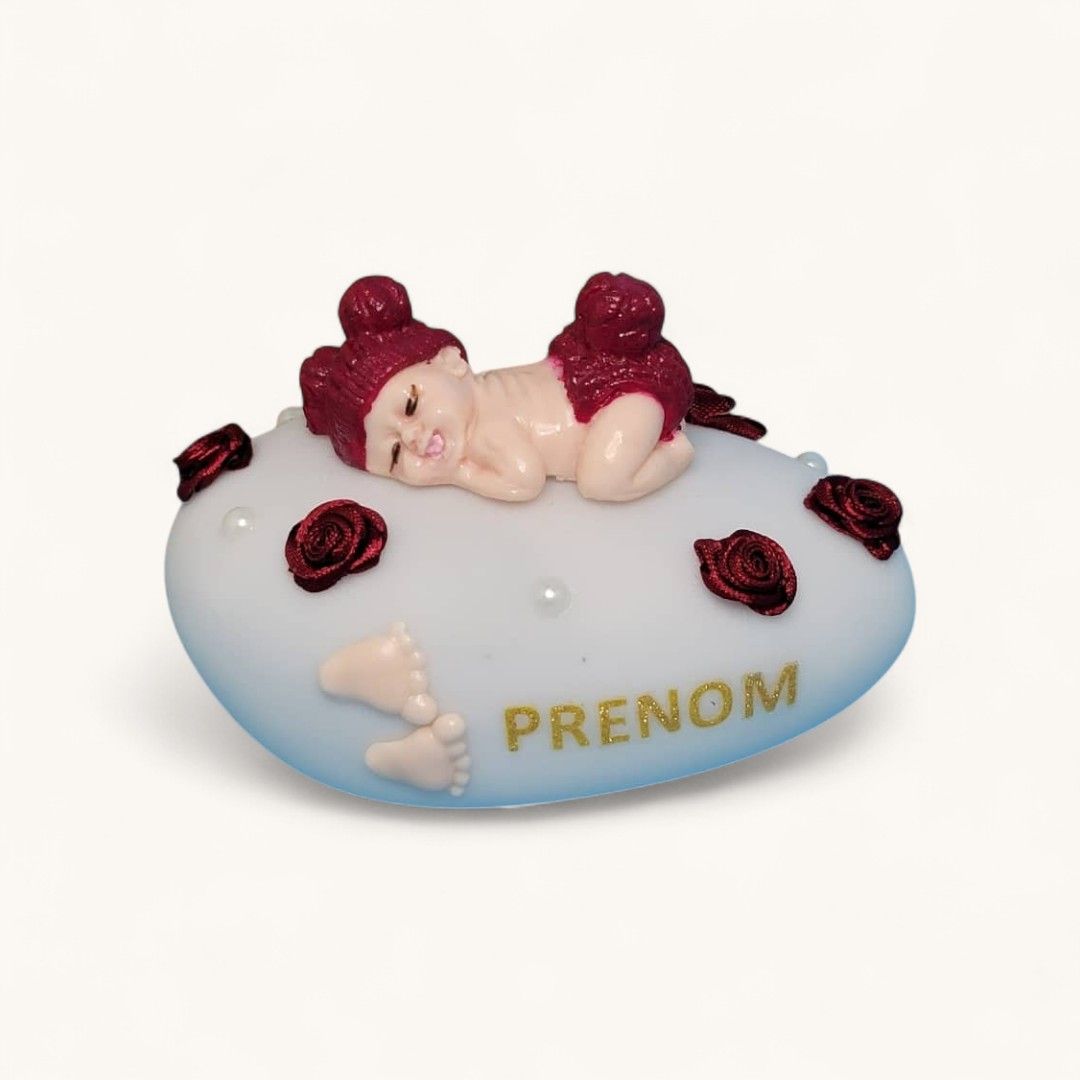 Veilleuse galet pour décoration avec un bébé en pâte polymère et différentes décorations, personnalisable sur demande et gratuitement